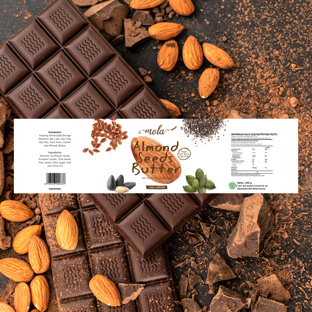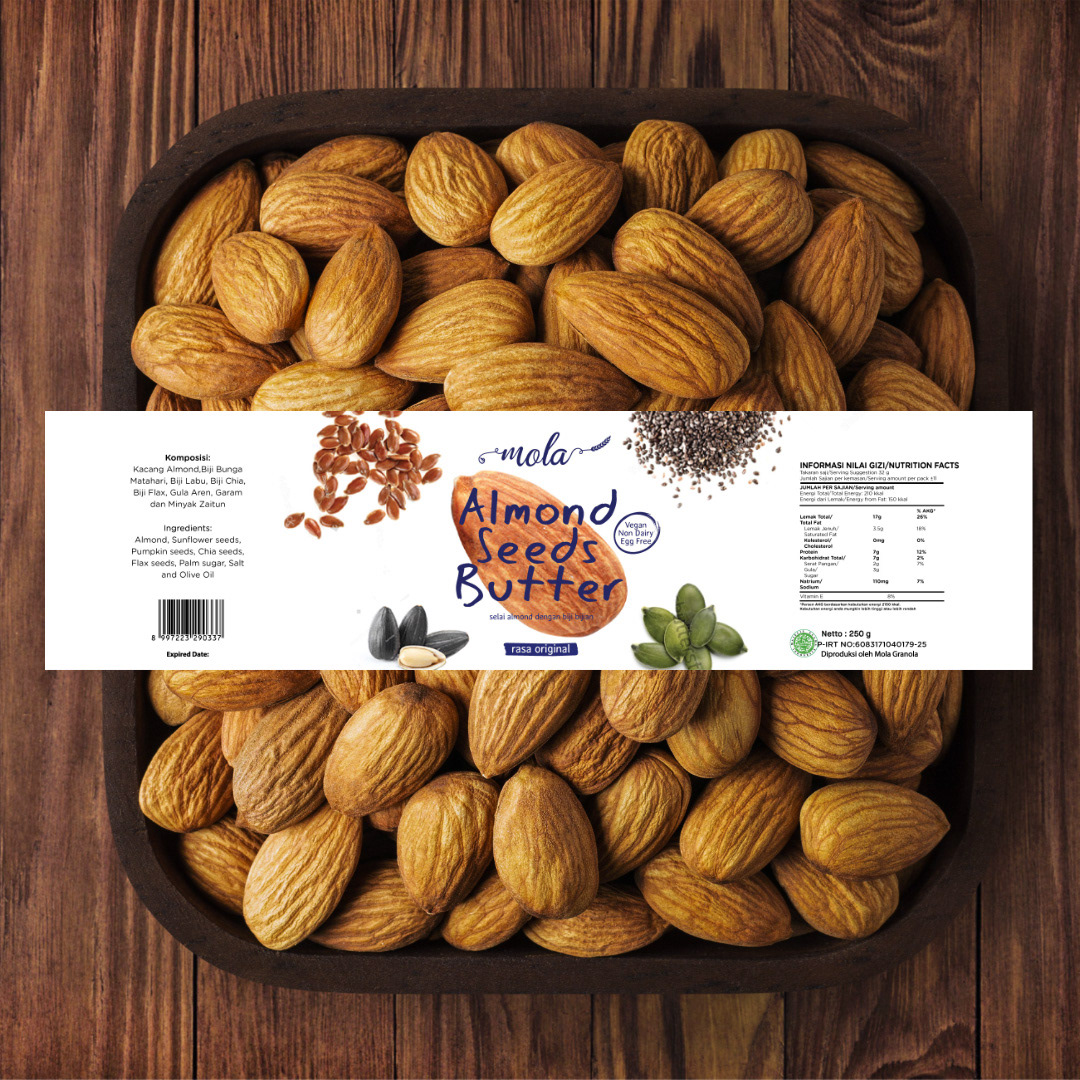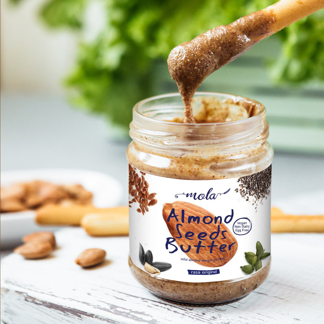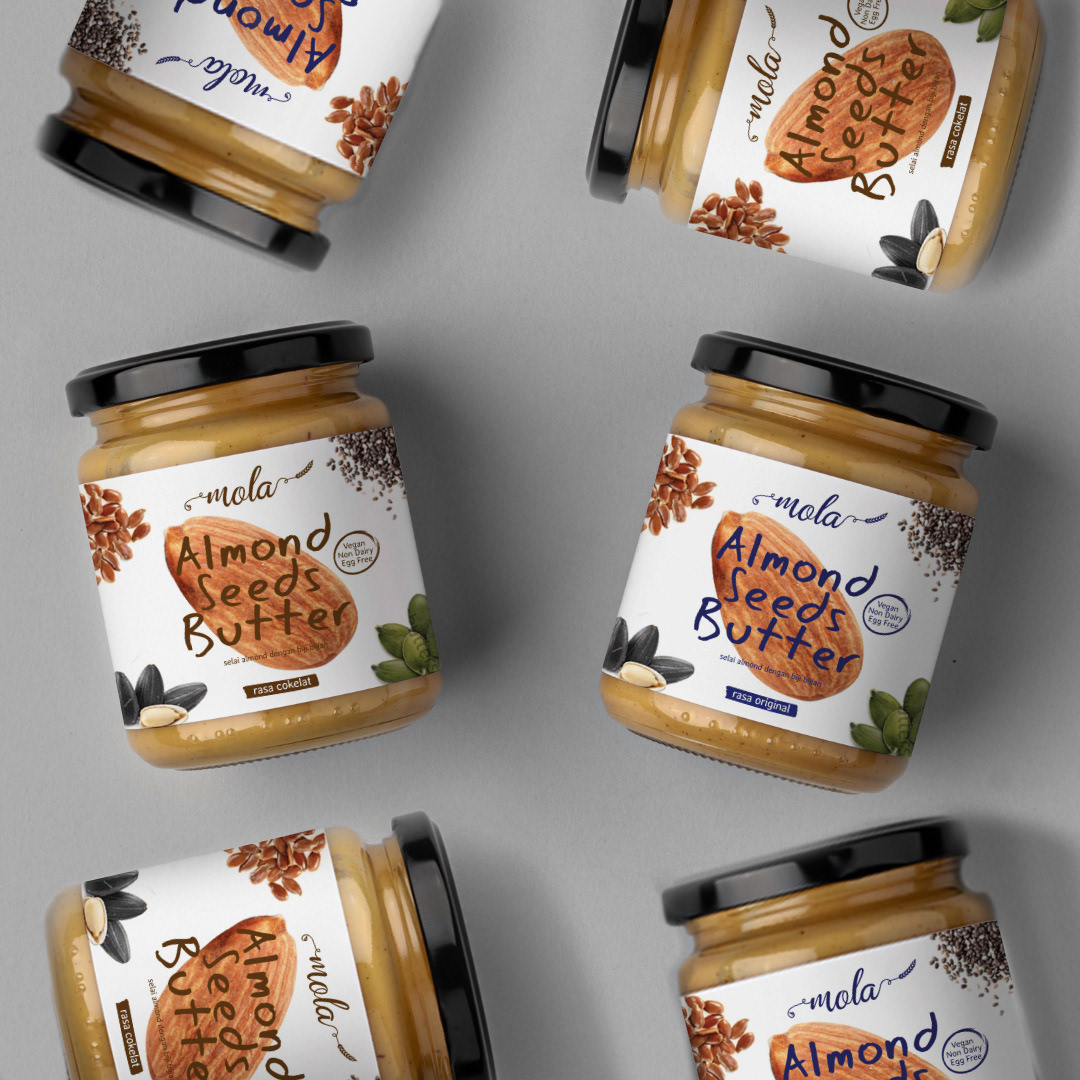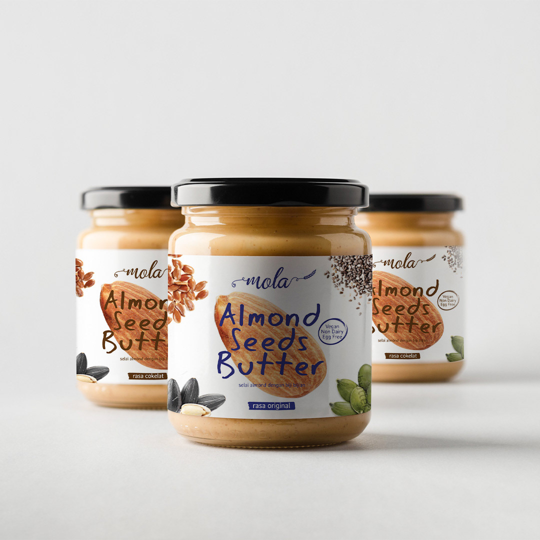 The packaging design for the almond seed butter product line features a simple, modern, and fun aesthetic. The use of soft, natural colors and hand-drawn illustrations of almond seeds emphasizes the wholesome and organic nature of the product. The clean, minimalist label allows the product to stand out, with playful typography that adds a touch of light-heartedness. The design effectively communicates the product’s key attributes, such as being vegan, non-dairy, and egg-free, making it appealing to health-conscious consumers. The overall look is inviting and contemporary, aligning well with current market trends.