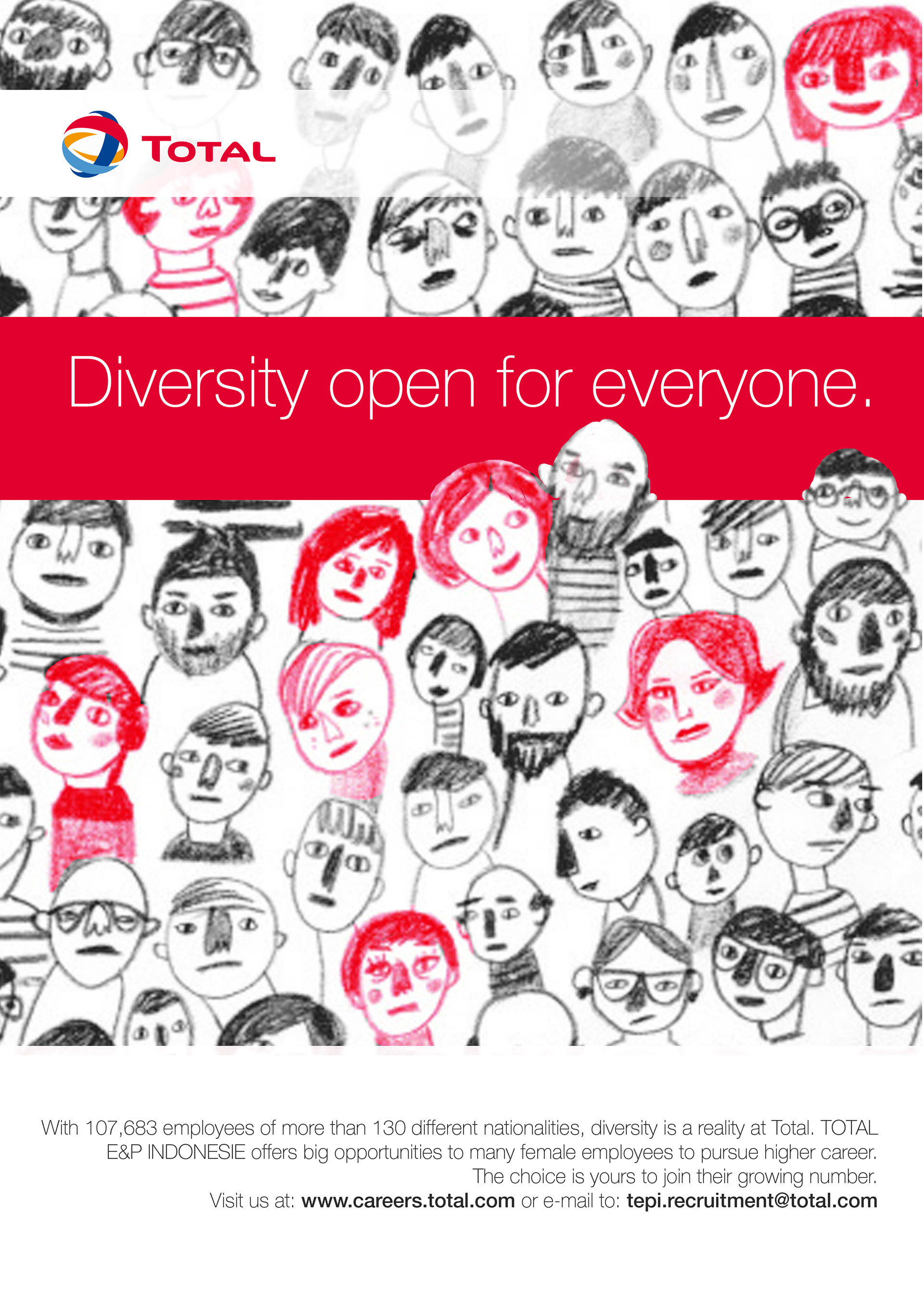 This advertisement focuses on highlighting Total’s commitment to diversity and inclusion. The illustration features a diverse group of hand-drawn faces, emphasizing individuality and the variety of people within the company. The use of red selectively draws attention to certain individuals, symbolizing the opportunities available, particularly for female employees. The central message, “Diversity open for everyone,” is bold and clear, reinforcing the idea that Total is an inclusive workplace. The overall design is both approachable and impactful, effectively communicating the company’s dedication to fostering a diverse and equitable environment.