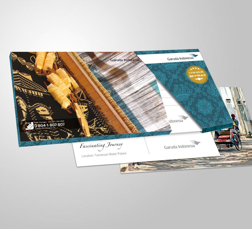 Postcard for Garuda Indonesia Airline. Batik theme. Showing tourism destination in Indonesia.
