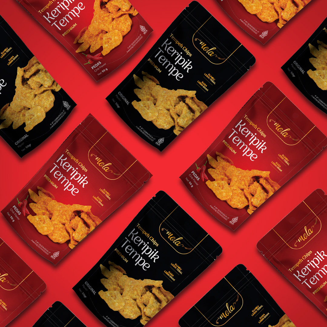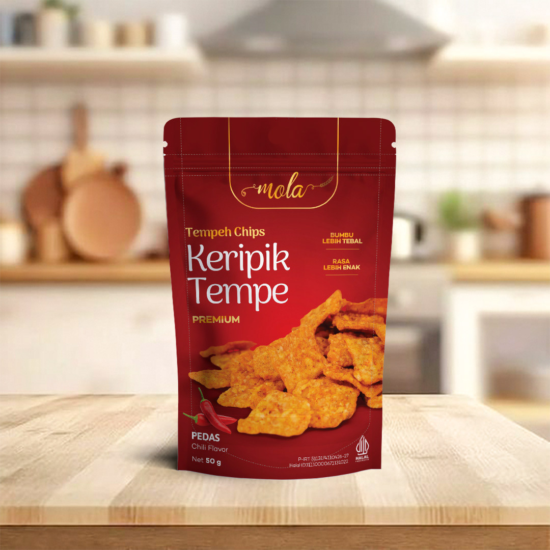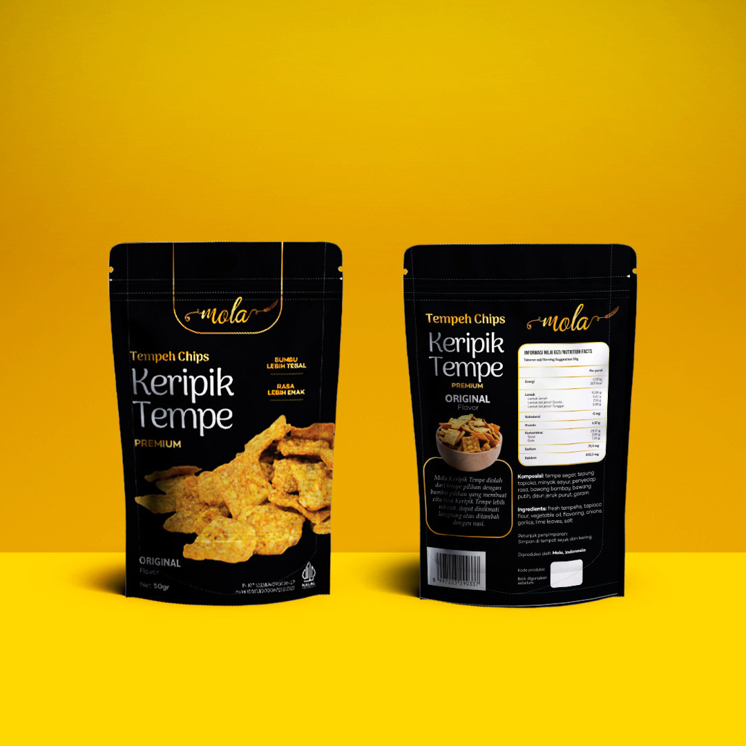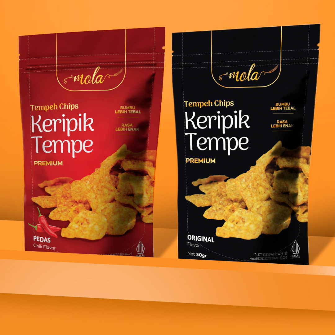 The packaging design for "Mola Keripik Tempe" highlights a modern yet authentic aesthetic, using bold contrasting colors to distinguish between flavor variants. The red pack represents the spicy "Pedas" flavor, while the black pack stands for the classic "Original." The gold accents and typography evoke a premium feel, emphasizing the snack's high-quality ingredients. Visual elements, such as the clear depiction of the crispy tempeh chips and the halal certification, cater to health-conscious consumers while maintaining a contemporary appeal. This design balances tradition and modernity, making the product stand out on the shelves.
